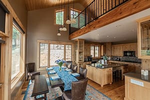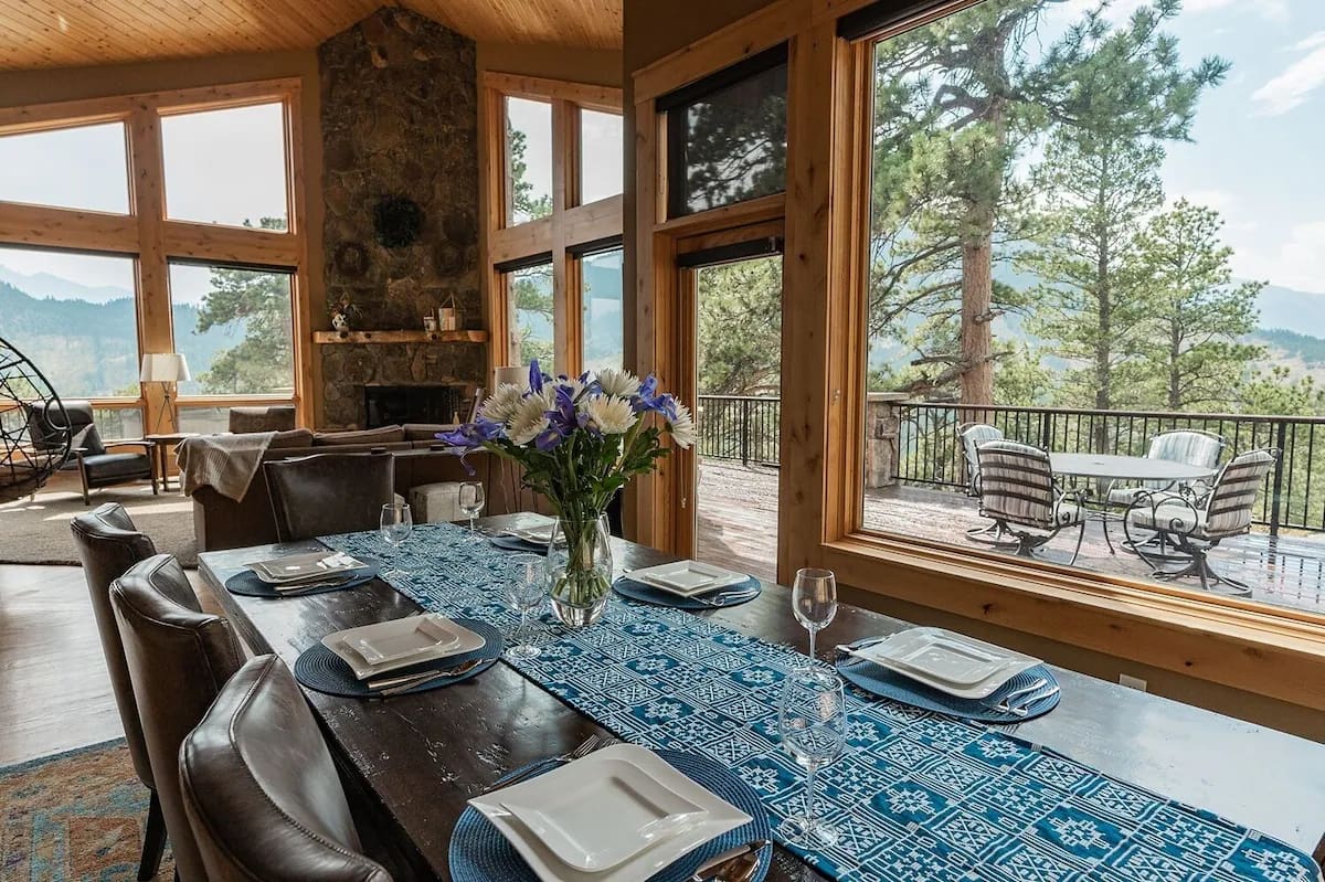The deluxe kitchen at Estes Peak Retreat is a chef’s dream, featuring spacious granite countertops, a luxurious island, and a high-end gas stove. Fully equipped with top-tier cookware and a selection of spices, it has everything needed to create gourmet meals. The adjoining dining area boasts an extended table, perfect for family reunions or lively gatherings with friends—all set against the stunning backdrop of the Rocky Mountains.