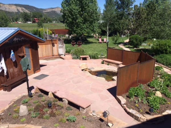 The Pond measures 40 feet across and reaches depths of up to five feet. Surrounding the pool on three sides, a redwood deck provides space to relax between soaks. Natural rock and boulders line the pond, and several seating areas allow guests to sit back and enjoy the views of 14,150-foot Mount Sneffels. Meanwhile, the naturally heated spring water maintains seasonal average temperatures between 100 and 106 degrees Fahrenheit. In addition, a small attached plunge pool offers cooler water, giving guests a refreshing place to cool off and take a break from the heat.