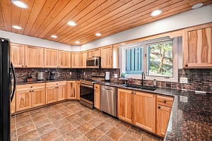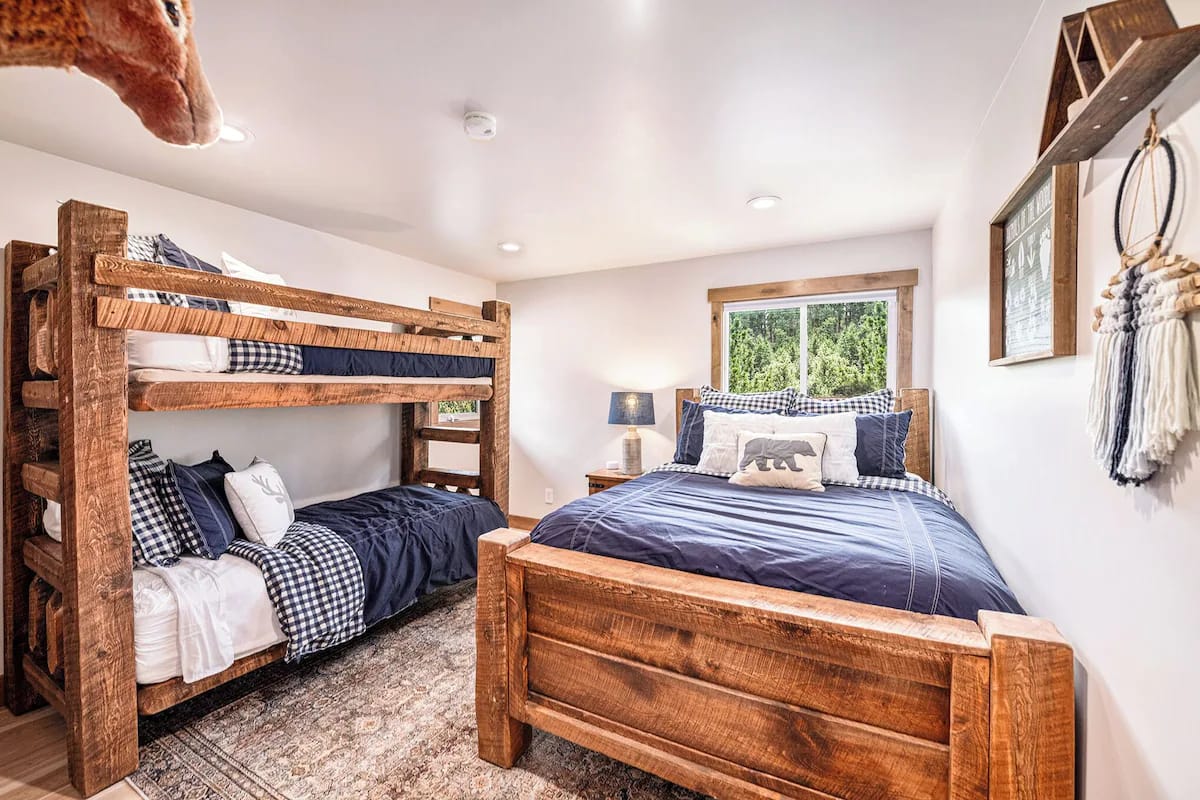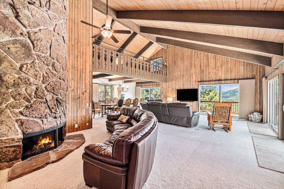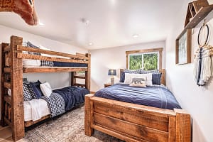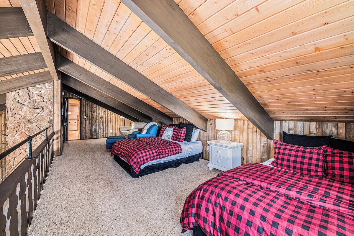 Walk in on the main floor to a cozy living room with a HD Smart TV. Off this living room is a bedroom with a queen bed and attached half bath/laundry combo. Upstairs is the main living room with another HD Smart TV, dining room, and kitchen. This level has a wrap-around deck and 4 large sliding glass doors that invite the indoors and outdoors to become one. Go up a half flight of stairs to the three bedrooms and bathrooms – 4 more steps lead to the loft with two queen beds and TV area. The three bedrooms consist of two suites with attached full bathrooms, and a third bedroom with a queen bed and twin over twin bunk bed.